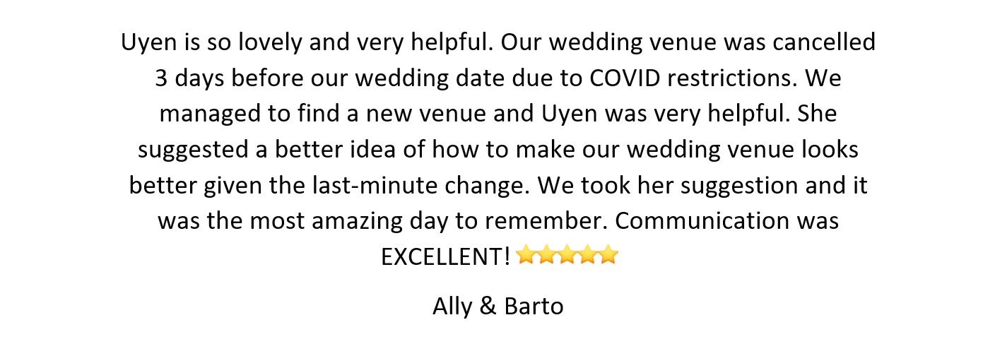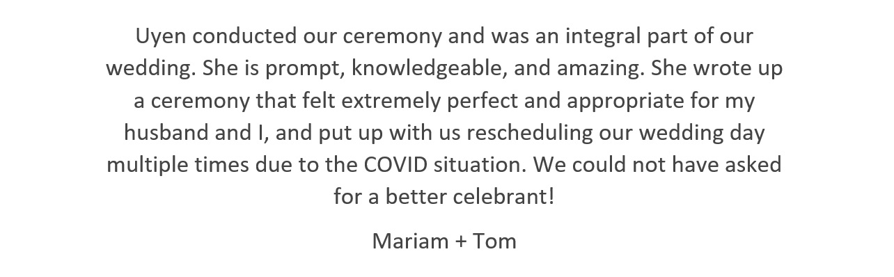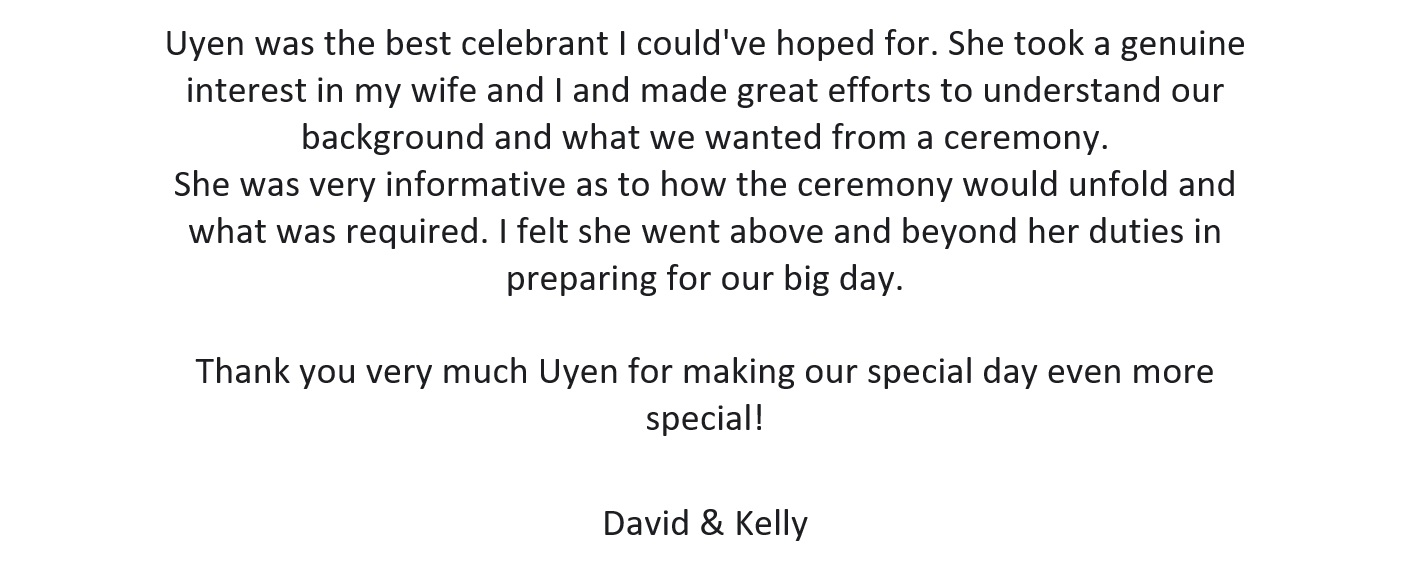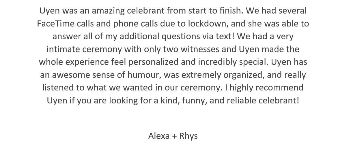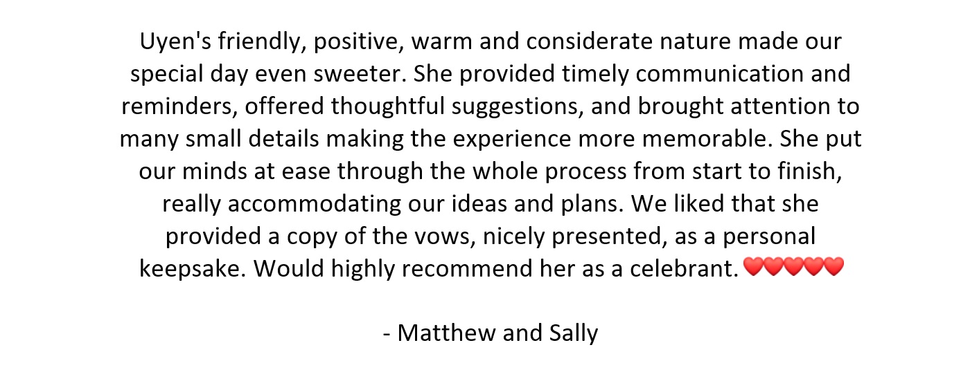 Hello there ! My name is Uyen Quach and I’m a Sydney based Wedding Celebrant.